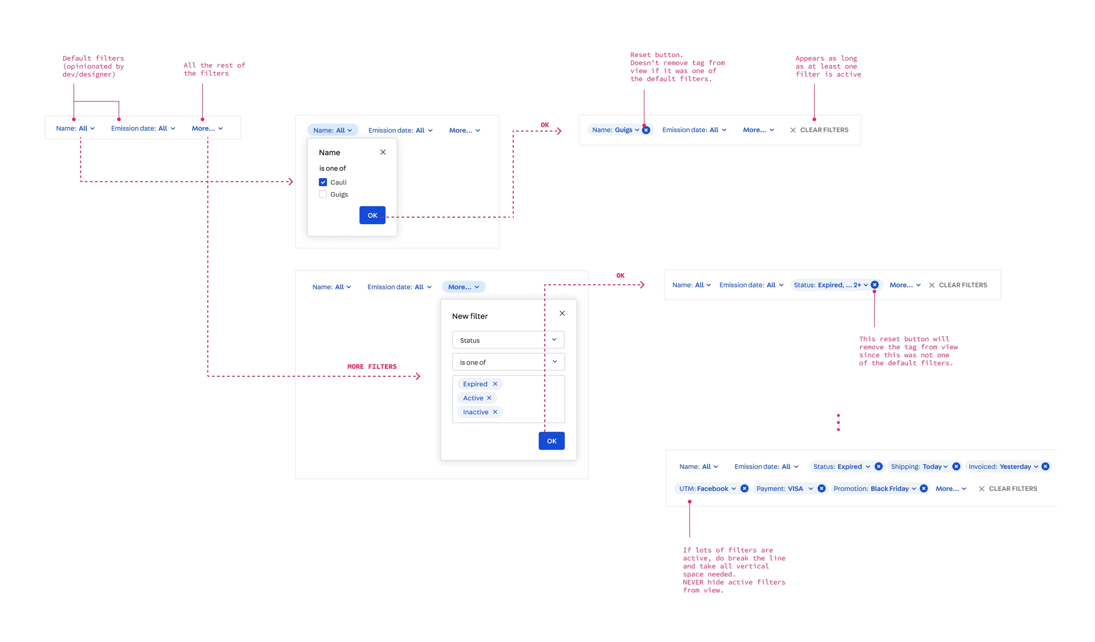 An audit around the platform revealed we had half a dozen different variations of filters. The problems ranged from bad interaction choices, visual hierarchy, information architecture, discoverability and flexibility.