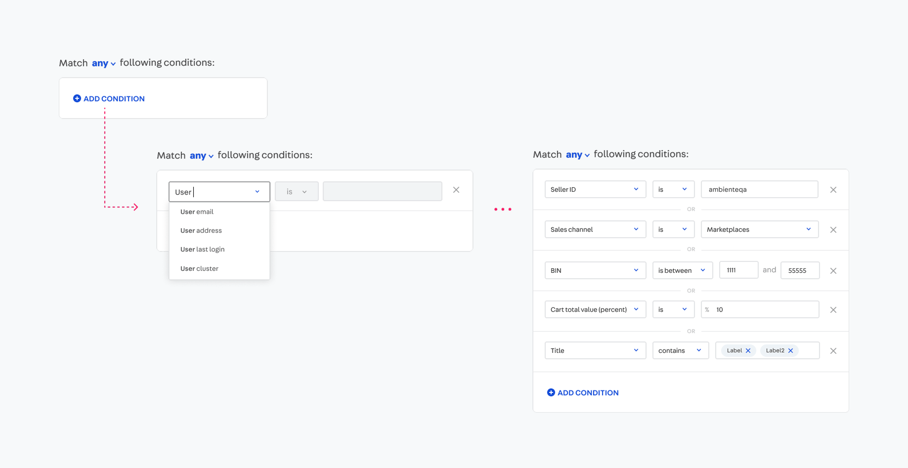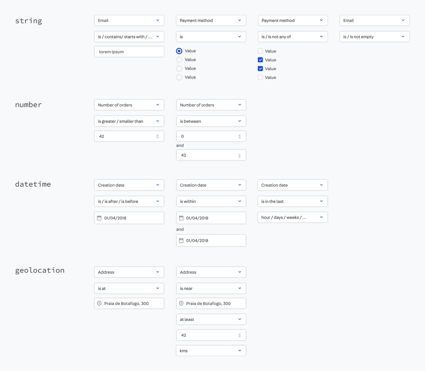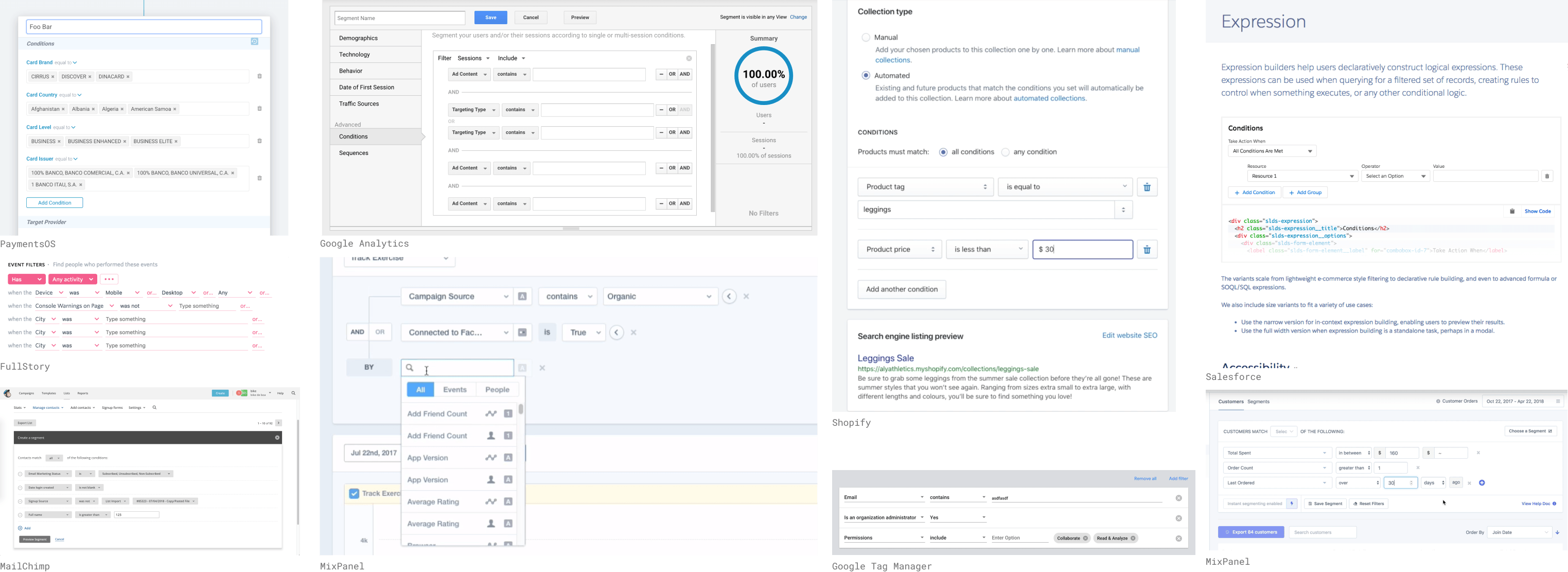 Looking at other digital products we found out this was a more common pattern than we initially thought, especially on the more advanced products. Some were truly inspiring, while others not that much. One common pitfall was giving control to each boolean operator individually, which can lead the user into creating unintentional precedence mistakes (e.g. in a OR b AND c the AND has precedence, but the user might not know that). Others had poor visual design, which made it look overwhelming and more complex it actually was.