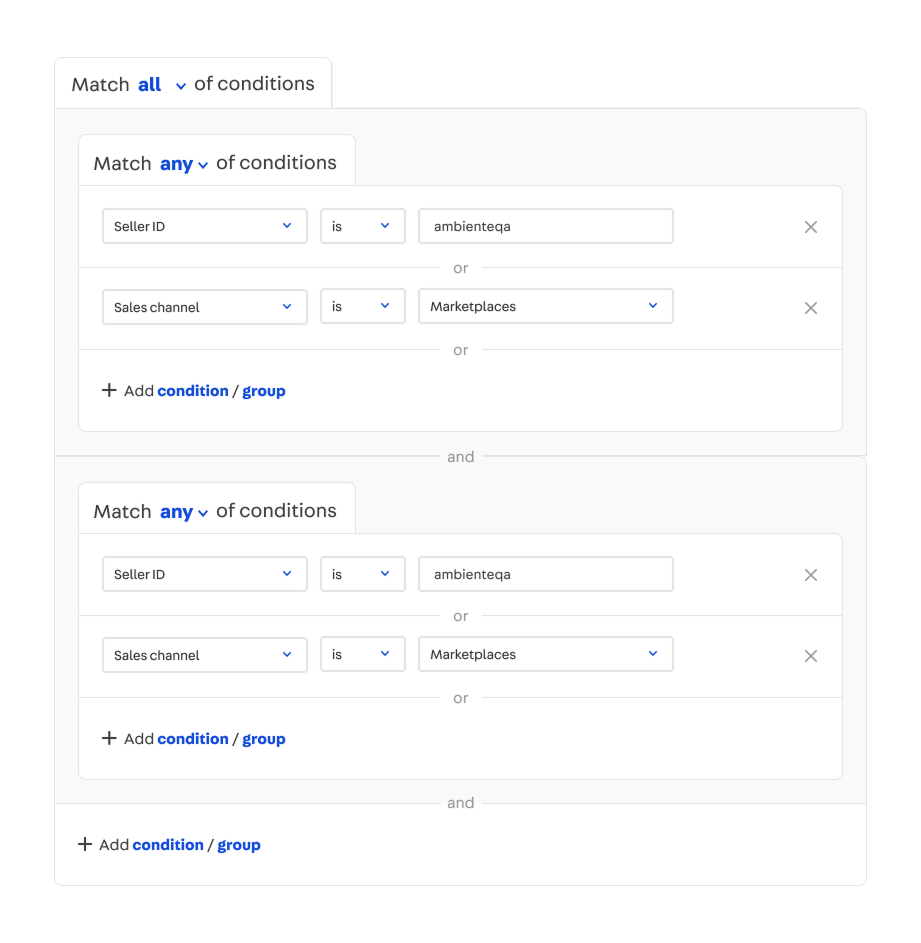 We designed a Conditions Builder to be a common pattern for adding multiple conditions with simple (first level) boolean relationships. To chose the boolean operator there’s a single global control, which prevents the precedence problem. It also helps users that are not used with boolean logic: either you chose that all conditions should be met or that any condition should be met.